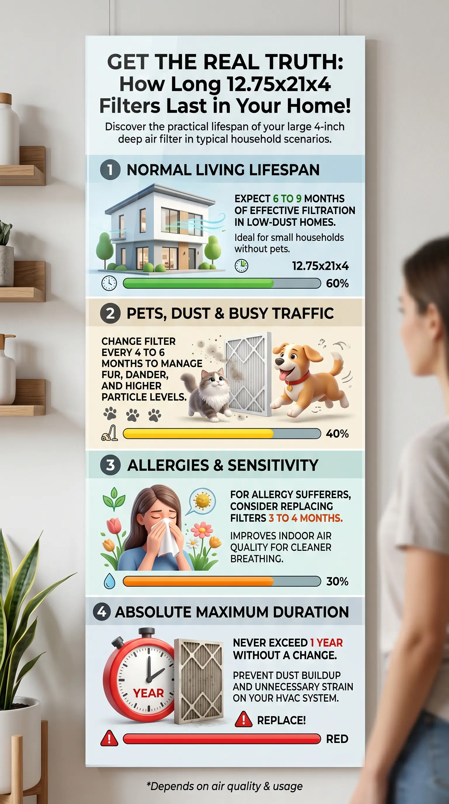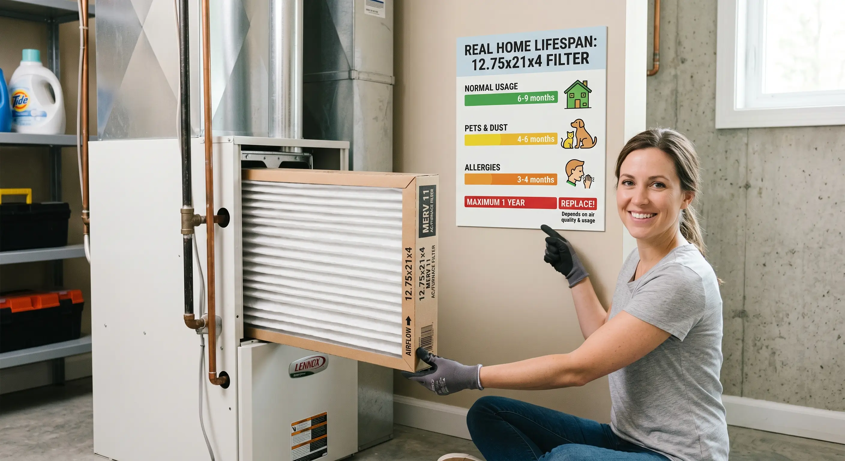 Six to twelve months. That's the real service life of a 12.75x21x4 air filter in a typical home, not the 90 days every big-box shelf-tag quotes. After more than a decade of making filters at our plants in Alabama, Florida, Pennsylvania, and Utah, we watch homeowners miss that window in both directions. Some replace too early and burn through money for no benefit. Others wait far too long and choke their HVAC. Even a reasonable change interval guide written for a common 1-inch size gets the 4-inch answer wrong. Here's what actually governs the number on your filter, why the 90-day rule belongs in the trash, and how to stop guessing.